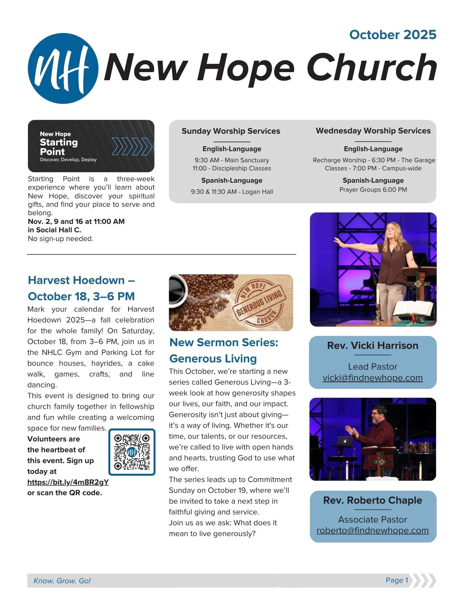 There’s a lot happening this month at New Hope—and you’re invited to be part of it all! Whether you're looking to grow in your faith, meet others, or serve your community, here’s what you can look forward to in October: