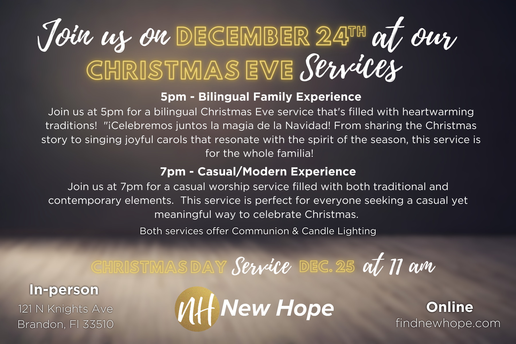 7pm, casual Christmas Eve service with both traditional and contemporary elements, English-speaking (with candles and communion)